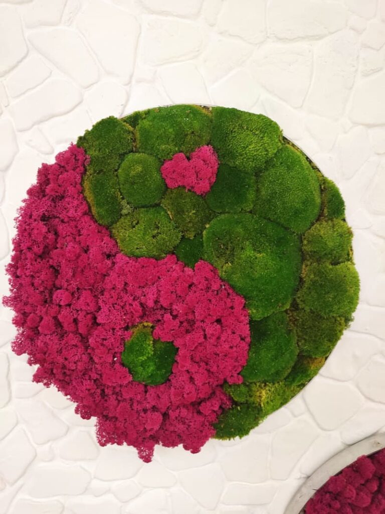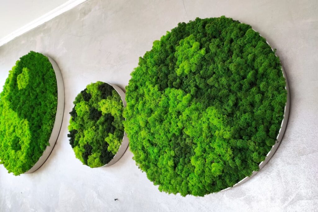 Runde Moosbilder aus Islandmoos in den Farben Frühlingsgrün und Mittelgrün bilden eine optimale Farbharmonie für Büroräume.