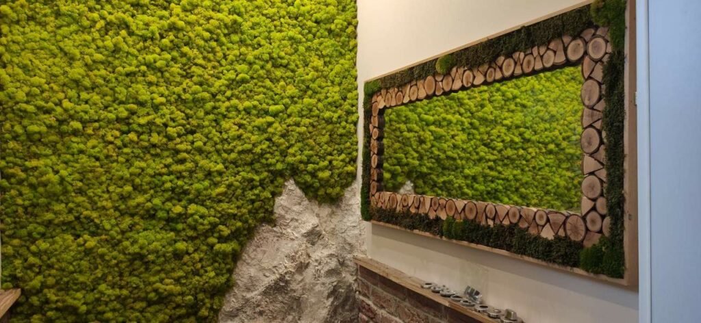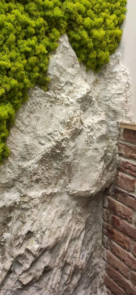 Hier hat unser Chef seiner Kreativität vollen Lauf gelassen. Wunderschönes Islandmoos in frühlingsgrün kombiniert mit piestone Felsgestaltung „Sassari“ an der Stirnwand montiert. Die Decke des Raumes ziert ebenfalls eine Felsgestaltung mit eingebauten Leuchten. Auf der rechten Seite befindet sich ein waagrecht montierter Spiegel. Die Einfassung des Spiegels besteht aus Holz, kombiniert mit Sticks und Dreiecke, sowie Wald Moos und kleines Boll Moos. Unterhalb des Spiegels ist eine piestone Ziegelwand montiert. Modell „Bronx“ in antik rot. Gegenüber blickt man auf eine Altholzwand. Alles in allem, ein sehr gelungenes kleines, aber feines Projekt.
